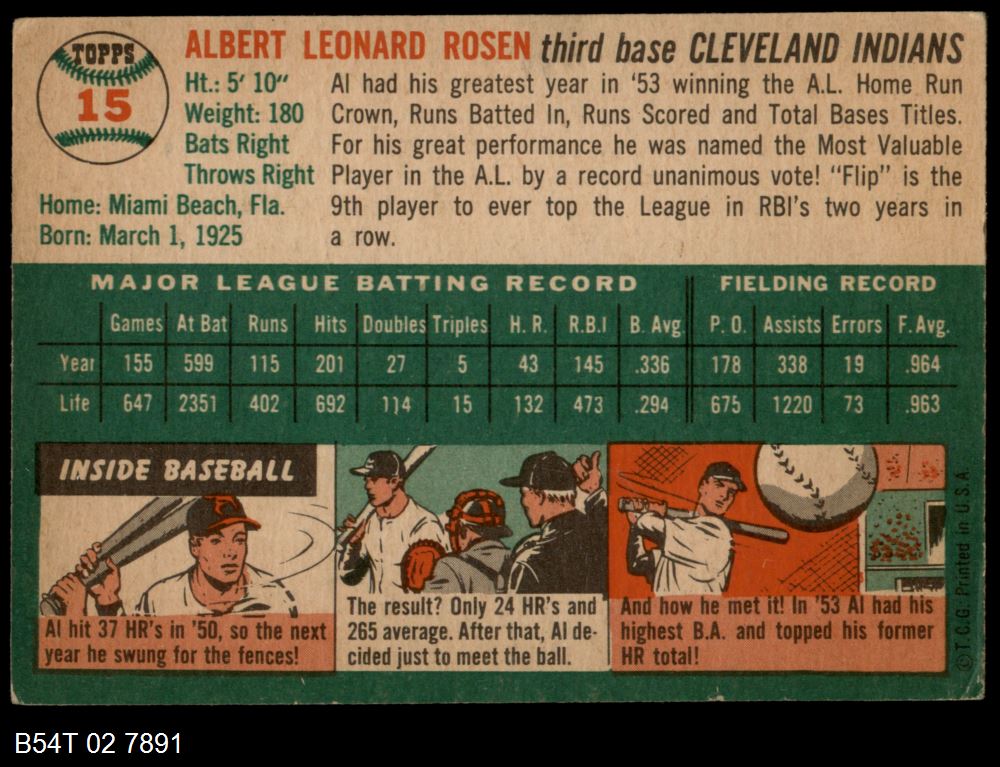 | 1954 Topps #15 WHT Al Rosen | 4 - VG/EX | Front | Back |