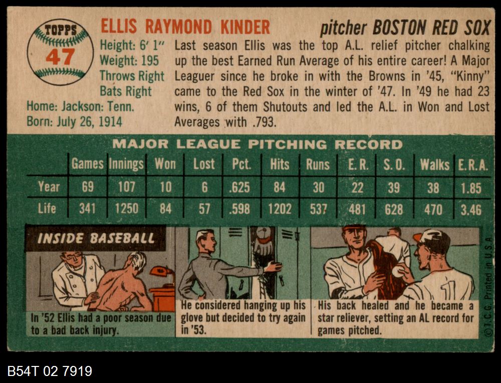 | 1954 Topps #47 WHT Ellis Kinder | 5 - EX | Front | Back |