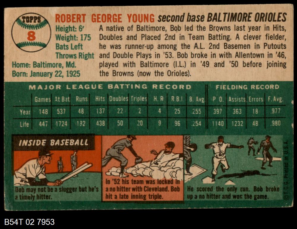 | 1954 Topps #8 WHT Bob Young | 4 - VG/EX | Front | Back |