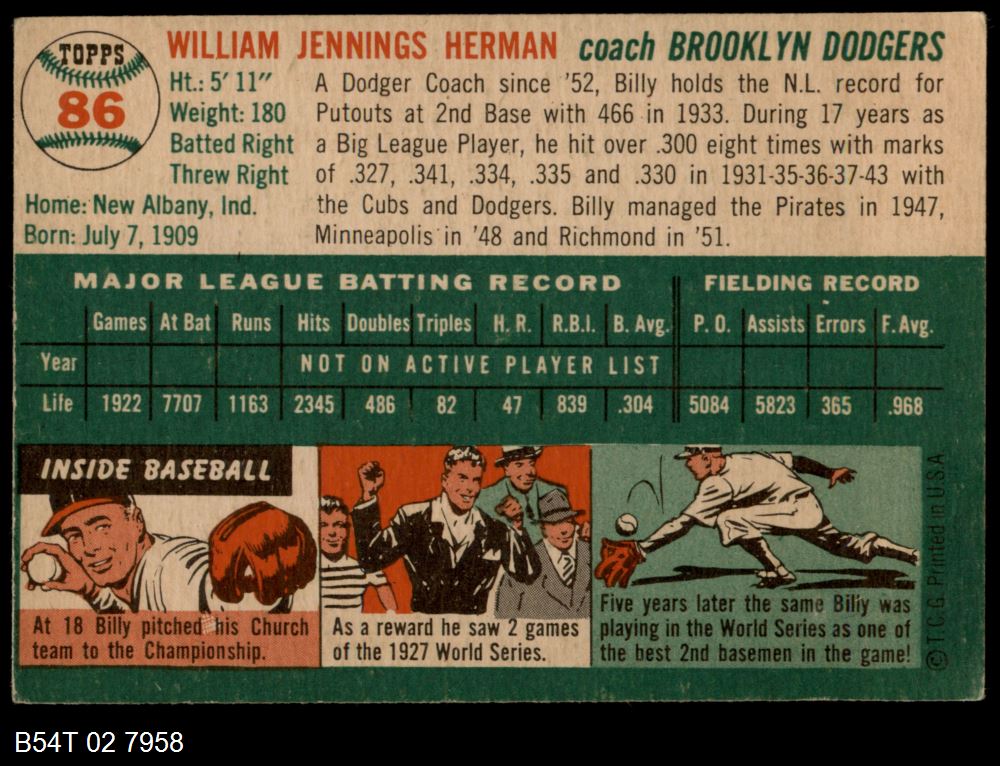 | 1954 Topps #86 Billy Herman | 5 - EX | Front | Back |