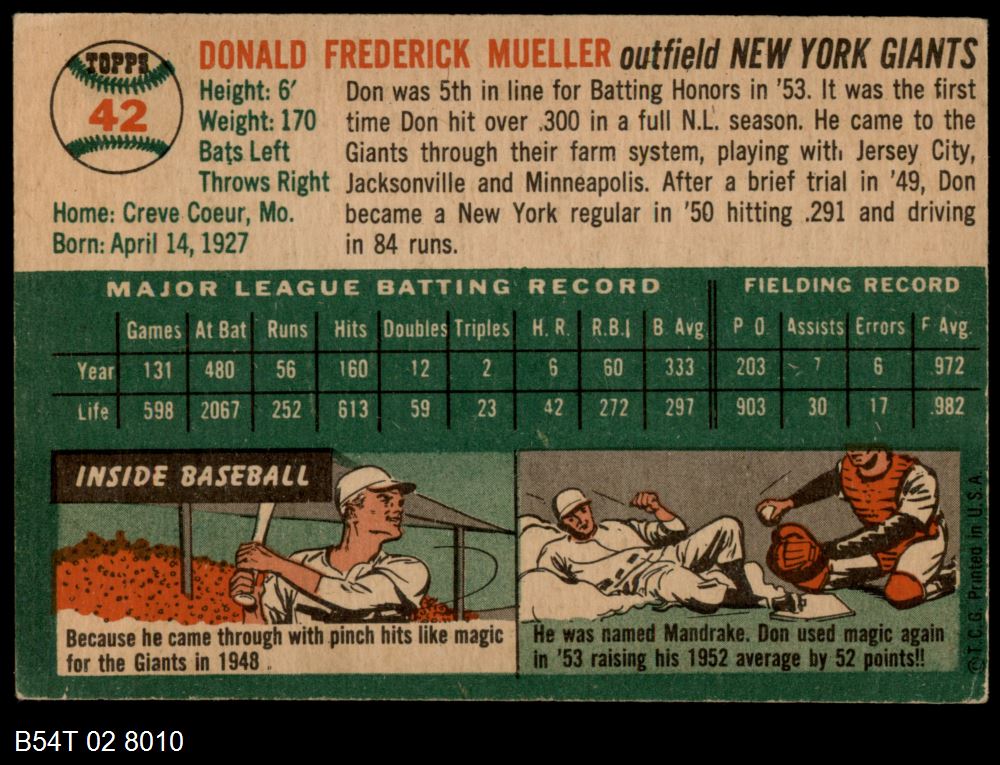 | 1954 Topps #42 WHT Don Mueller | 4 - VG/EX | Front | Back |