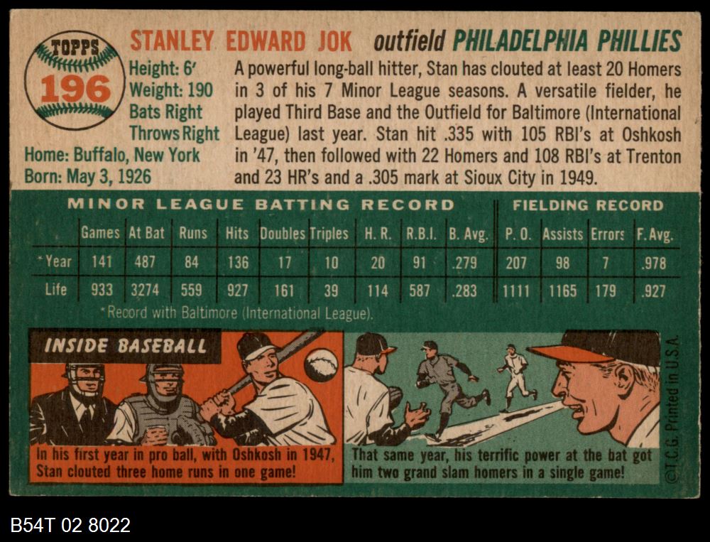 | 1954 Topps #196 Stan Jok | 4 - VG/EX | Front | Back |