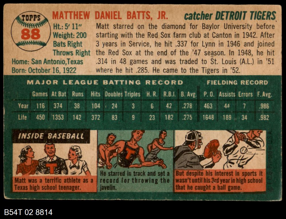 | 1954 Topps #88 Matt Batts | 3 - VG | Front | Back |