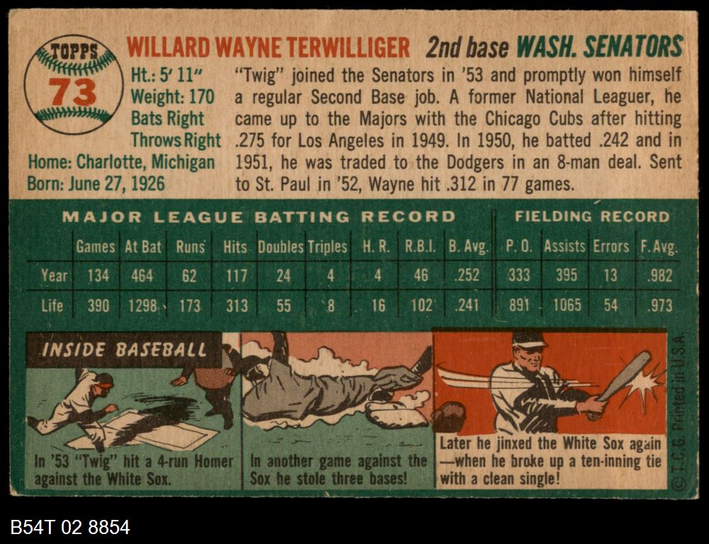 | 1954 Topps #73 Wayne Terwilliger | 4 - VG/EX | Front | Back |