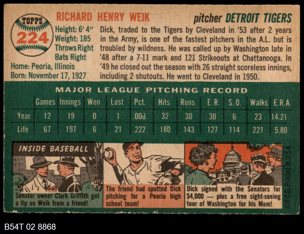 | 1954 Topps #224 Dick Weik | 4 - VG/EX | Front | Back |