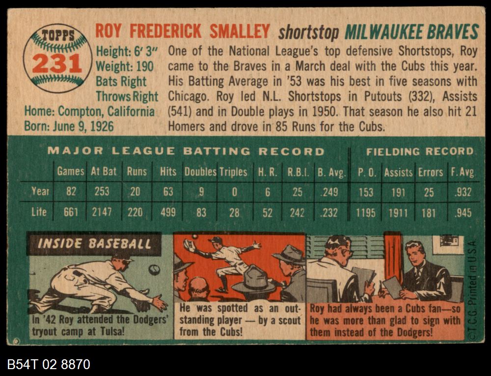| 1954 Topps #231 Roy Smalley | 4 - VG/EX | Front | Back |