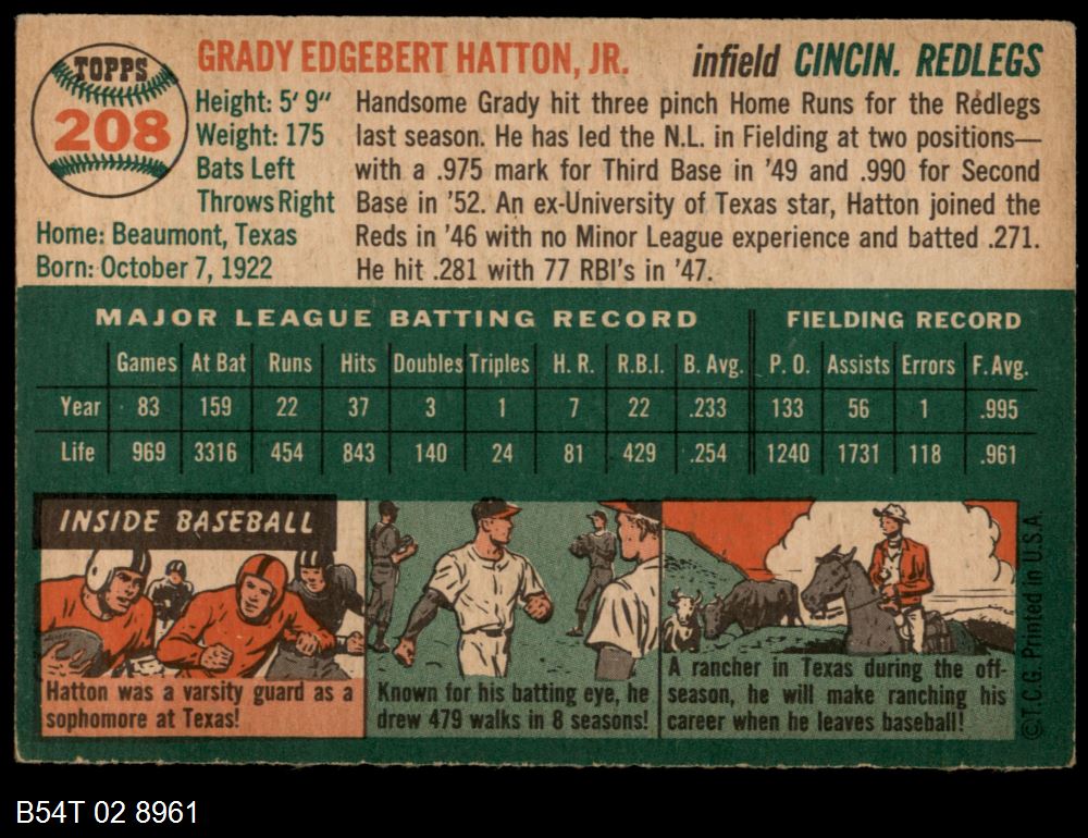 | 1954 Topps #208 Grady Hatton | 3 - VG | Front | Back |