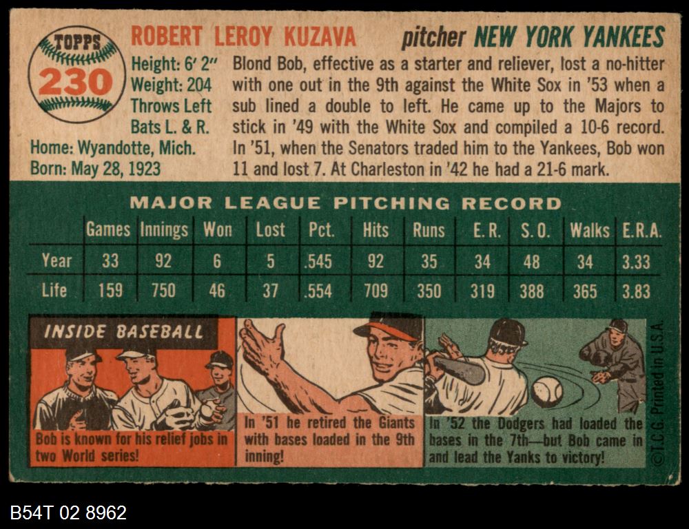 | 1954 Topps #230 Bob Kuzava | 4 - VG/EX | Front | Back |
