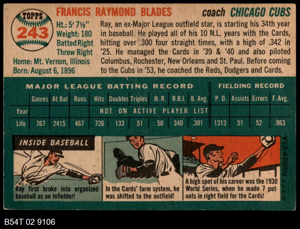 | 1954 Topps #243 Ray Blades | 5 - EX | Front | Back |