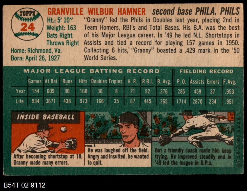 | 1954 Topps #24 WHT Granny Hamner | 4 - VG/EX | Front | Back |
