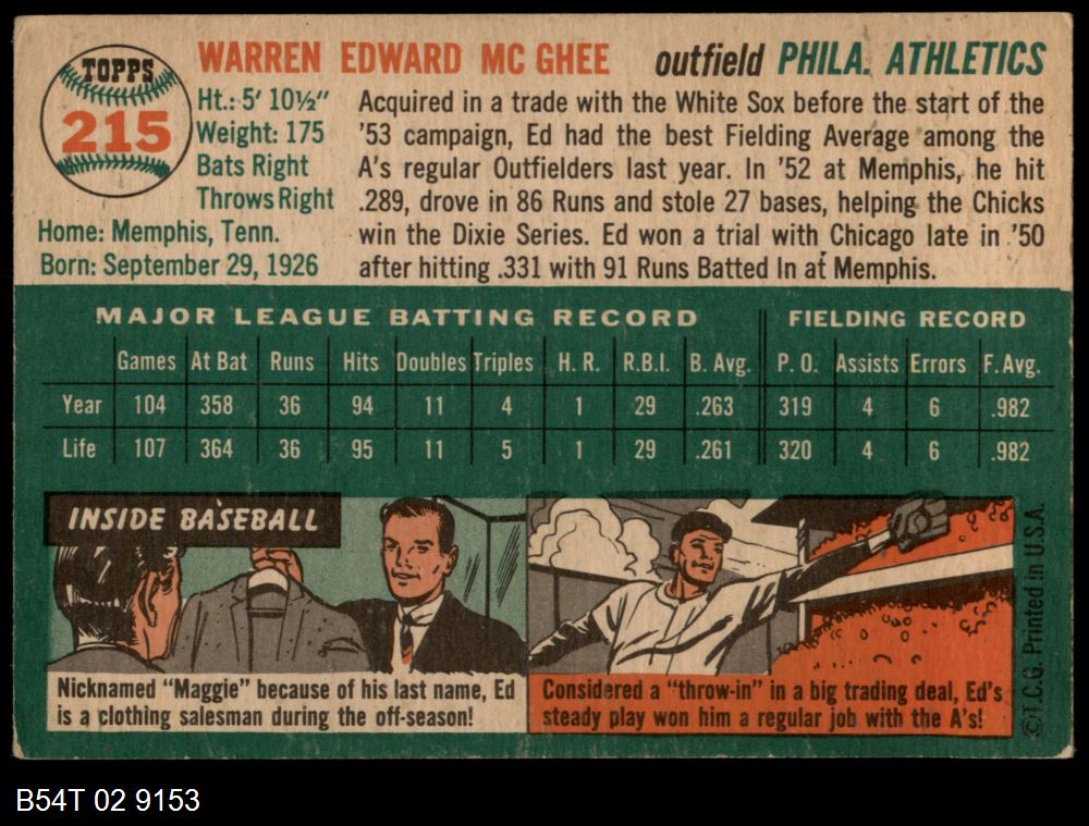 | 1954 Topps #215 Ed McGhee | 4 - VG/EX | Front | Back |