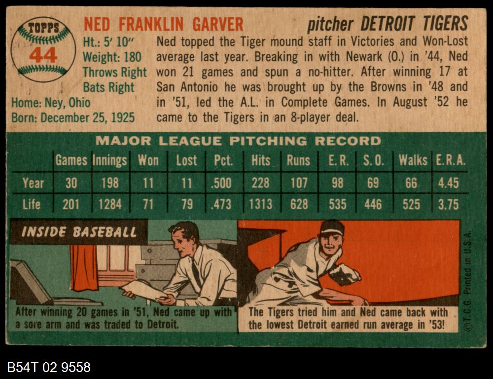 | 1954 Topps #44 WHT Ned Garver | 5 - EX | Front | Back |