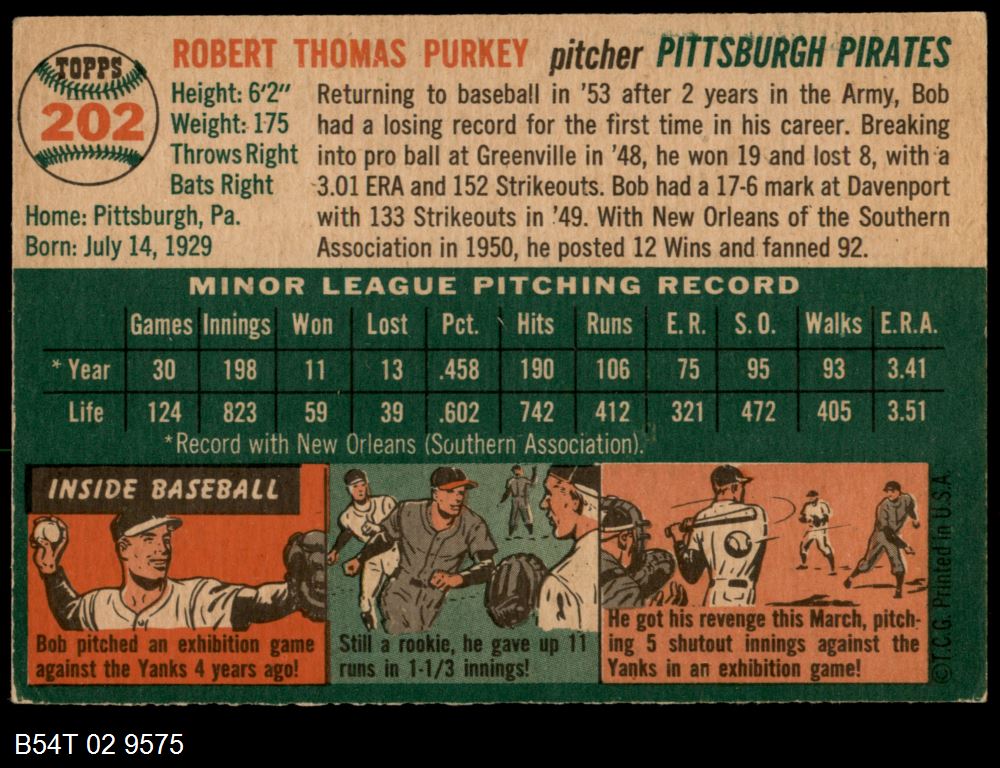 | 1954 Topps #202 Bob Purkey | 4 - VG/EX | Front | Back |