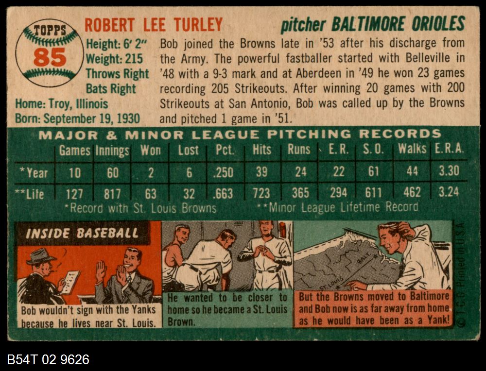 | 1954 Topps #85 Bob Turley | 4 - VG/EX | Front | Back |