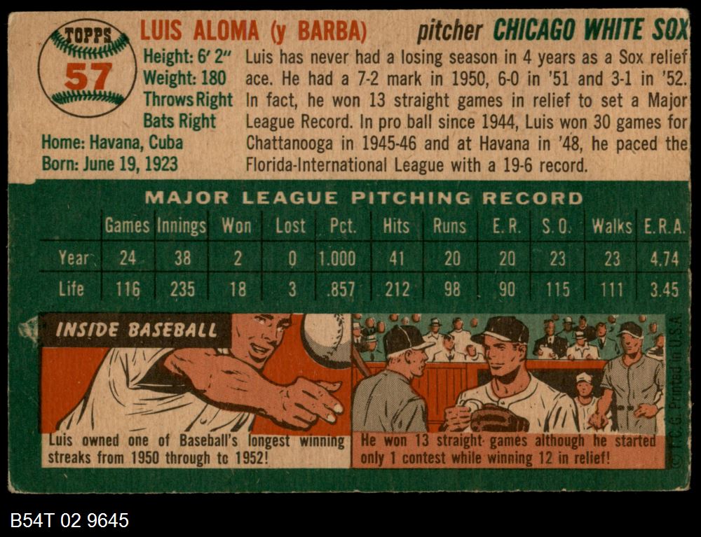 | 1954 Topps #57 Luis Aloma | 3 - VG | Front | Back |