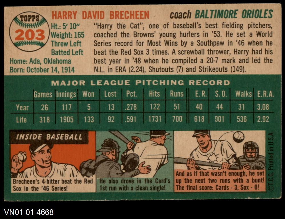 | 1954 Topps #203 Harry Brecheen | 4 - VG/EX | Front | Back |