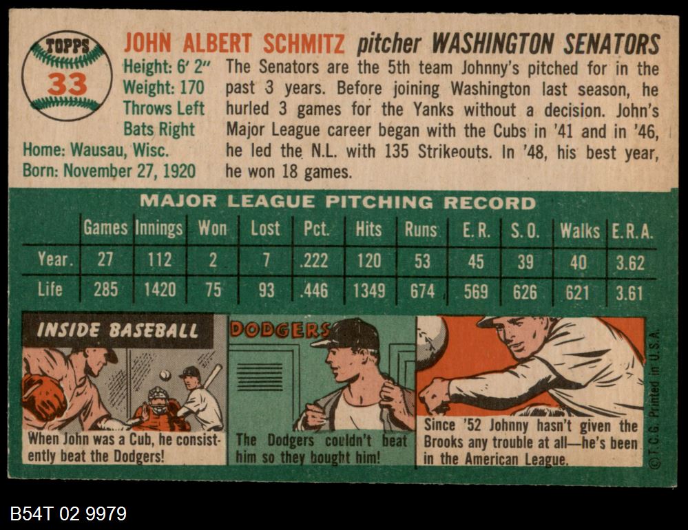 | 1954 Topps #33 WHT Johnny Schmitz | 5 - EX | Front | Back |