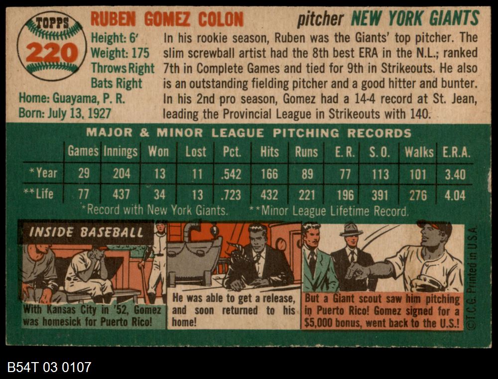 | 1954 Topps #220 Ruben Gomez | 4 - VG/EX | Front | Back |