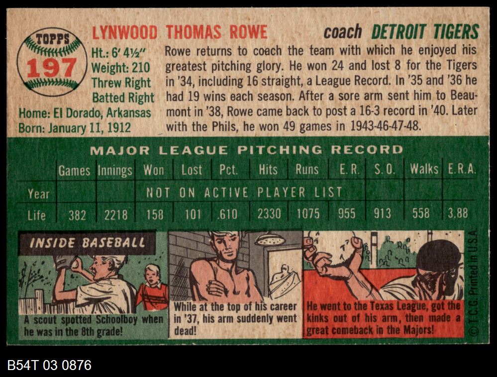 | 1954 Topps #197 Schoolboy Rowe | 6 - EX/MT | Front | Back |