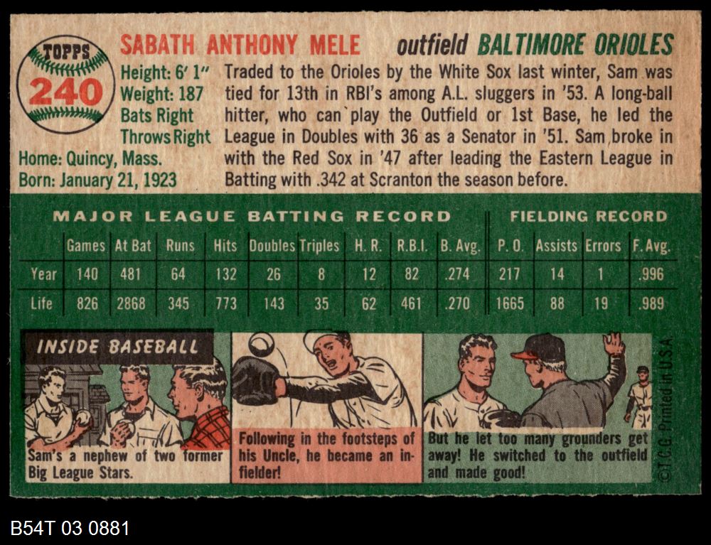 | 1954 Topps #240 Sam Mele | 5 - EX | Front | Back |