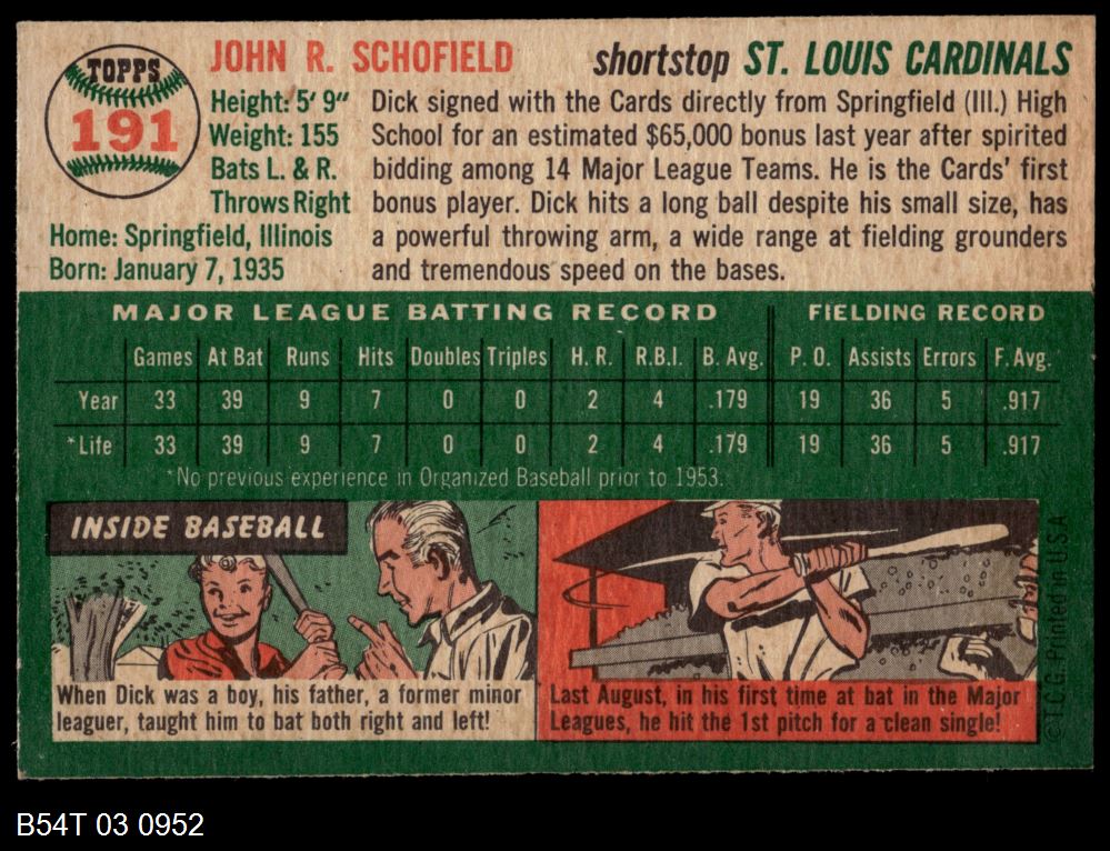 | 1954 Topps #191 Dick Schofield | 4 - VG/EX | Front | Back |