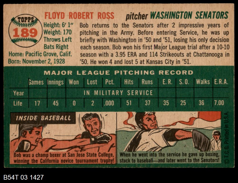 | 1954 Topps #189 Line can be through or not through last S in Ross Bob Ross | 5 - EX | Front | Back |