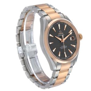 Grey teak pattern dial with rose gold luminous hands and index hour markers. Date calendar window at 3 o'clock aperture. |