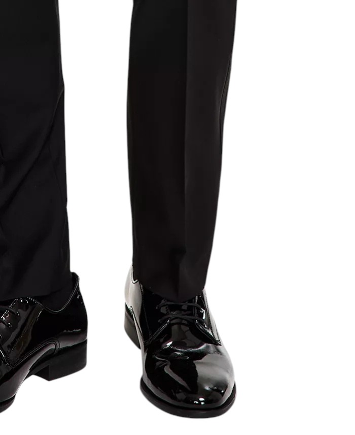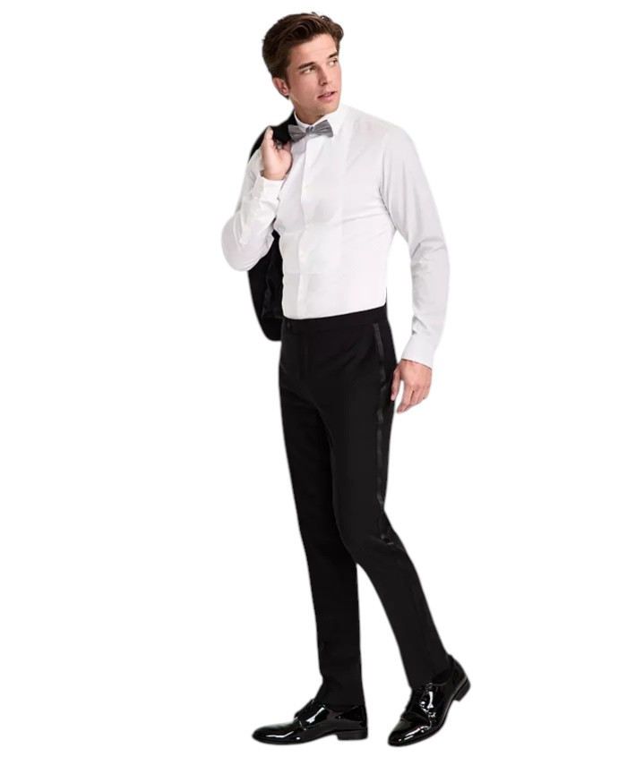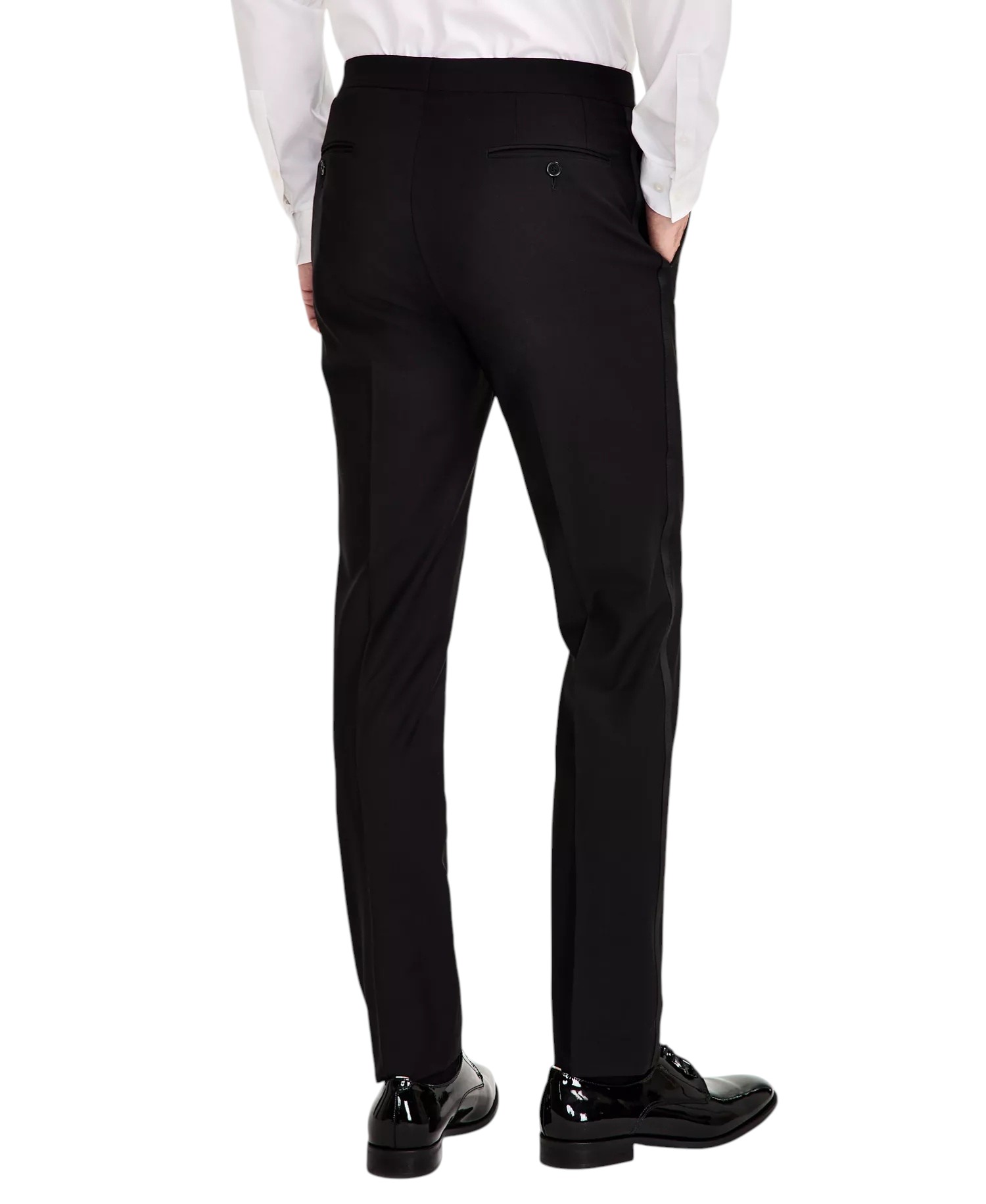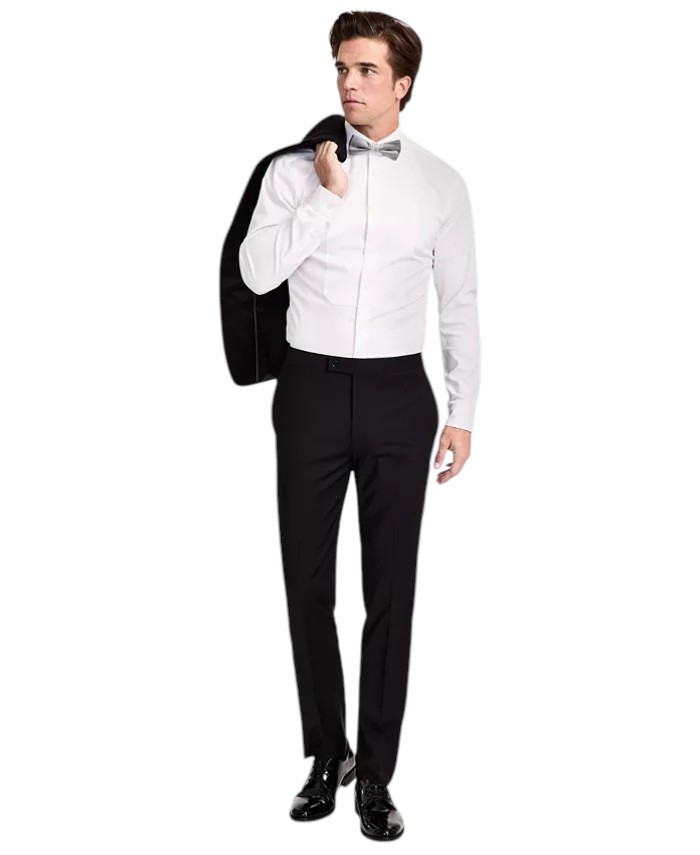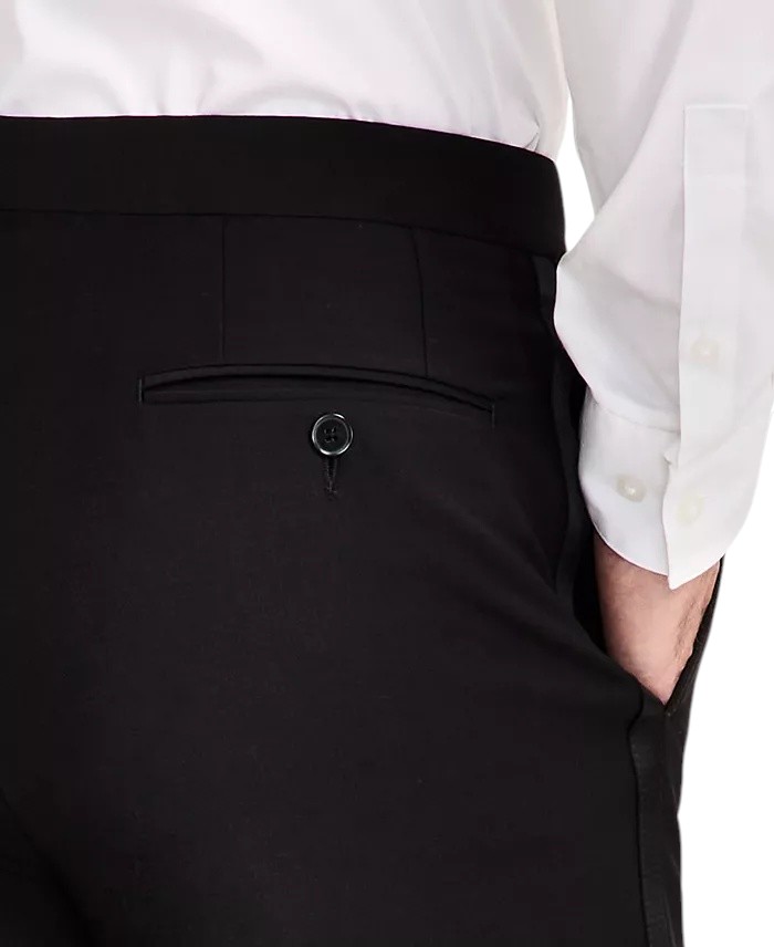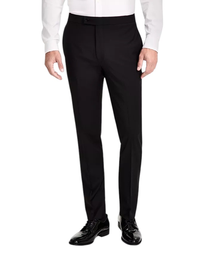 With a touch of stretch that lets you comfortably dance the night away, these Calvin Klein tuxedo pants offer a slim fit and the enduring style of wool-blend fabric.