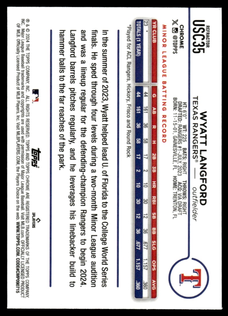 2024 Topps Chrome Update Wyatt Langford Refractor RC Texas Rangers #USC35