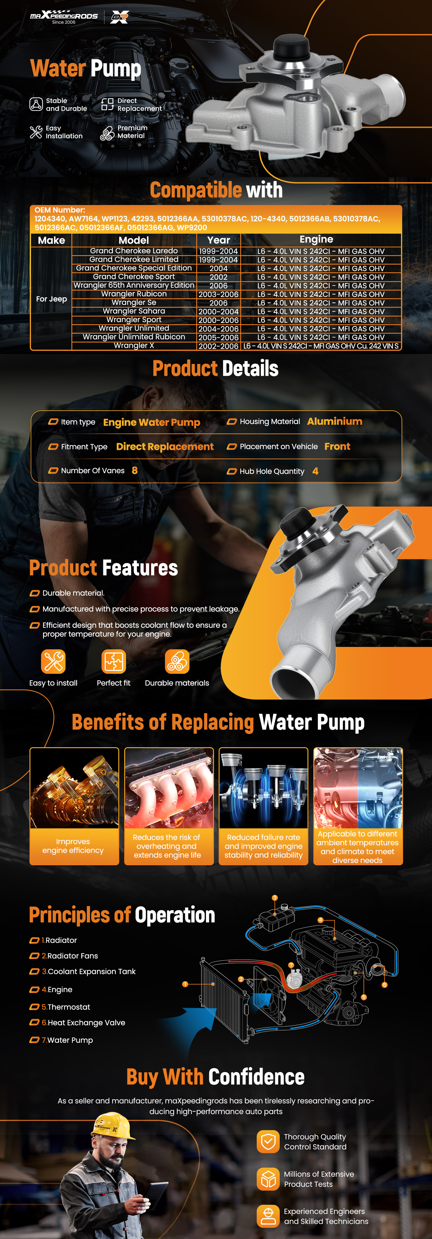 8 Vane Water Pump for Jeep Wrangler Sahara 2000-2004 4.0L OHV 1204340 AW7164