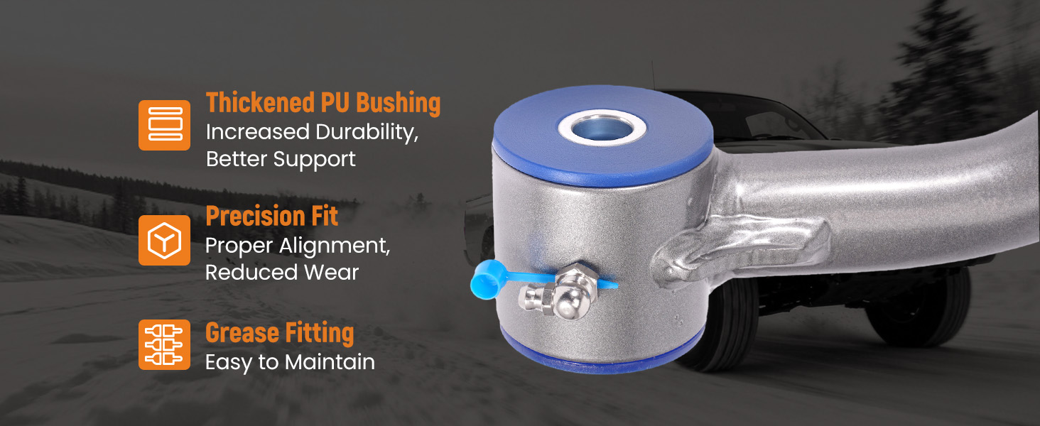1. Polyurethane Bushings, zert fittings for easy lubrication. Ball joints come with 90-degree zerk fittings.