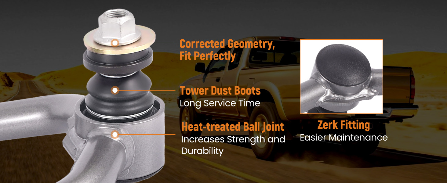 Ball Joint Pre-assembled for easy installation. Eliminates tire wear while improving stability.