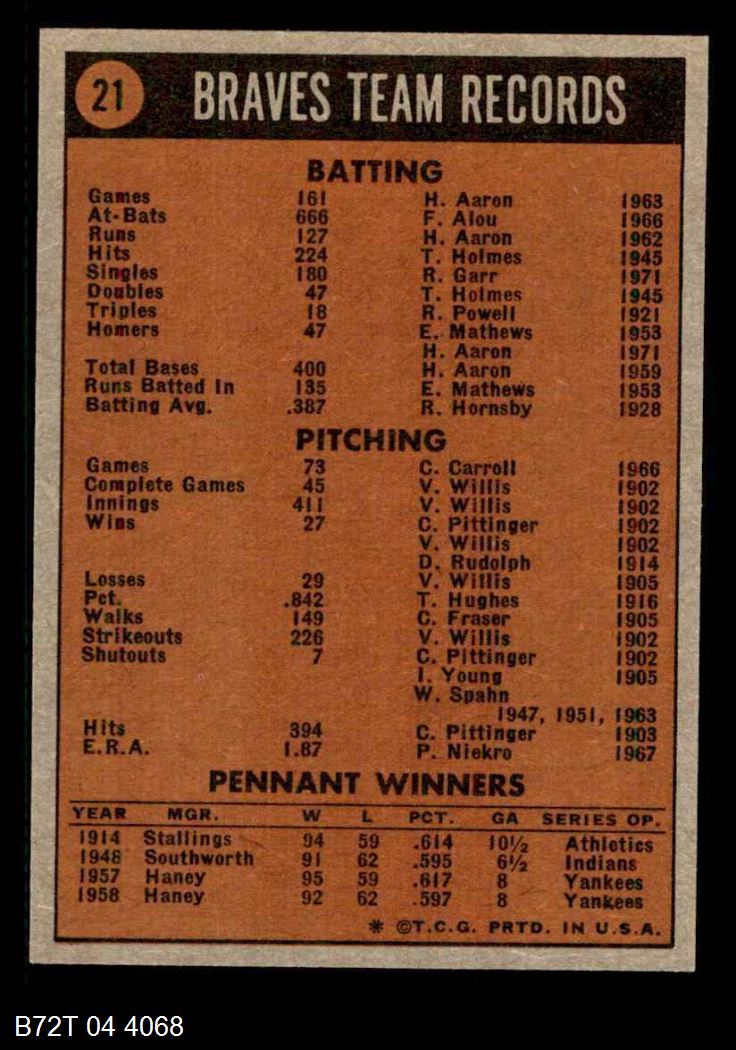 | 1972 Topps #21 Braves Team | 7.5 - NM+ | Front | Back |