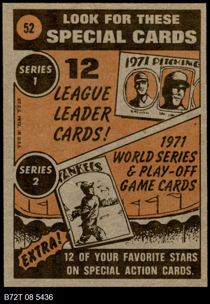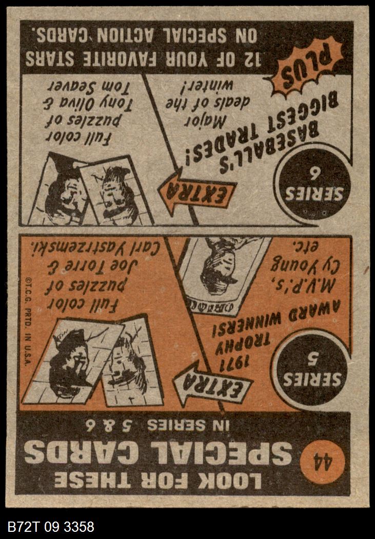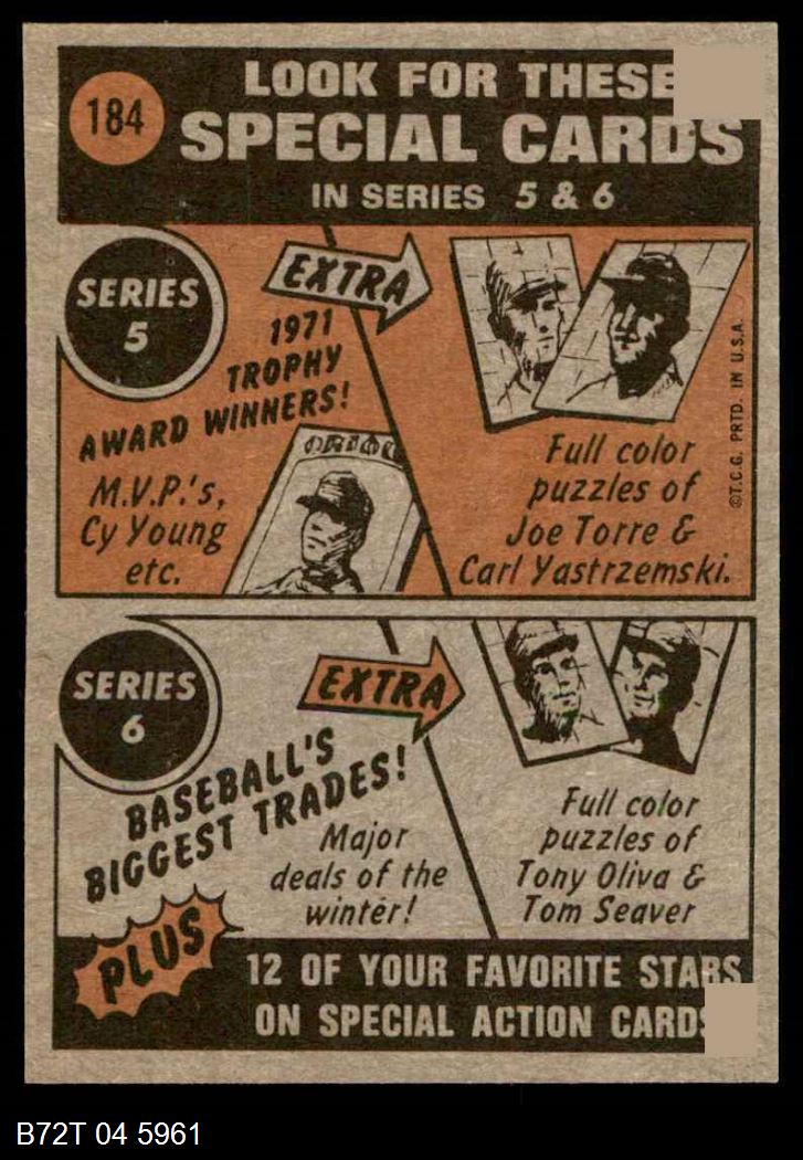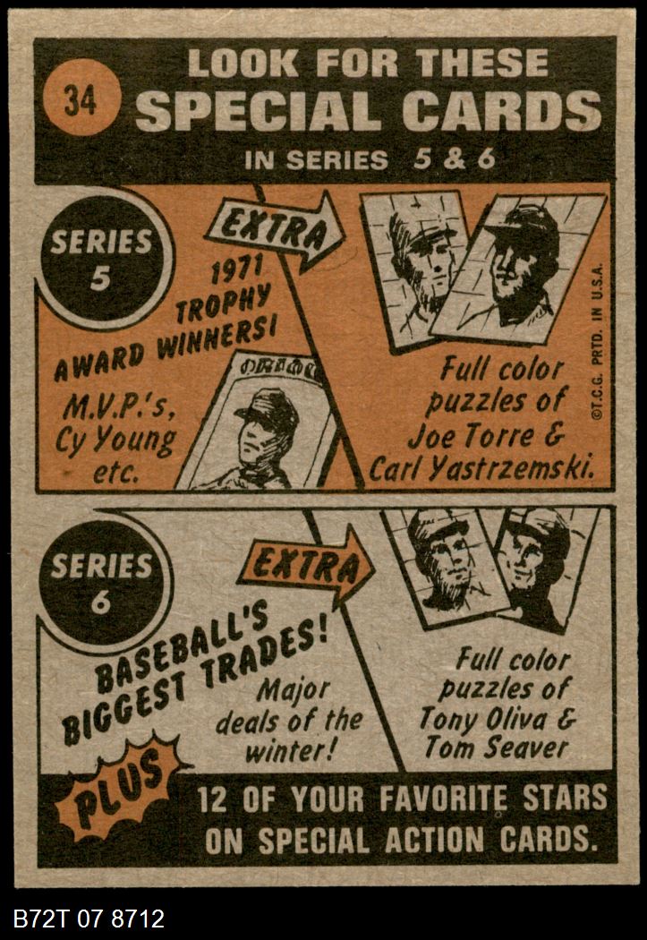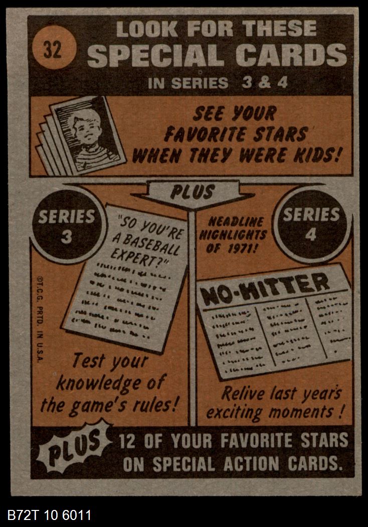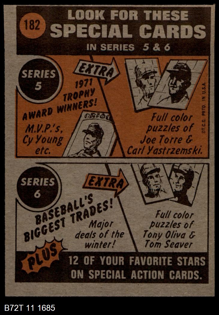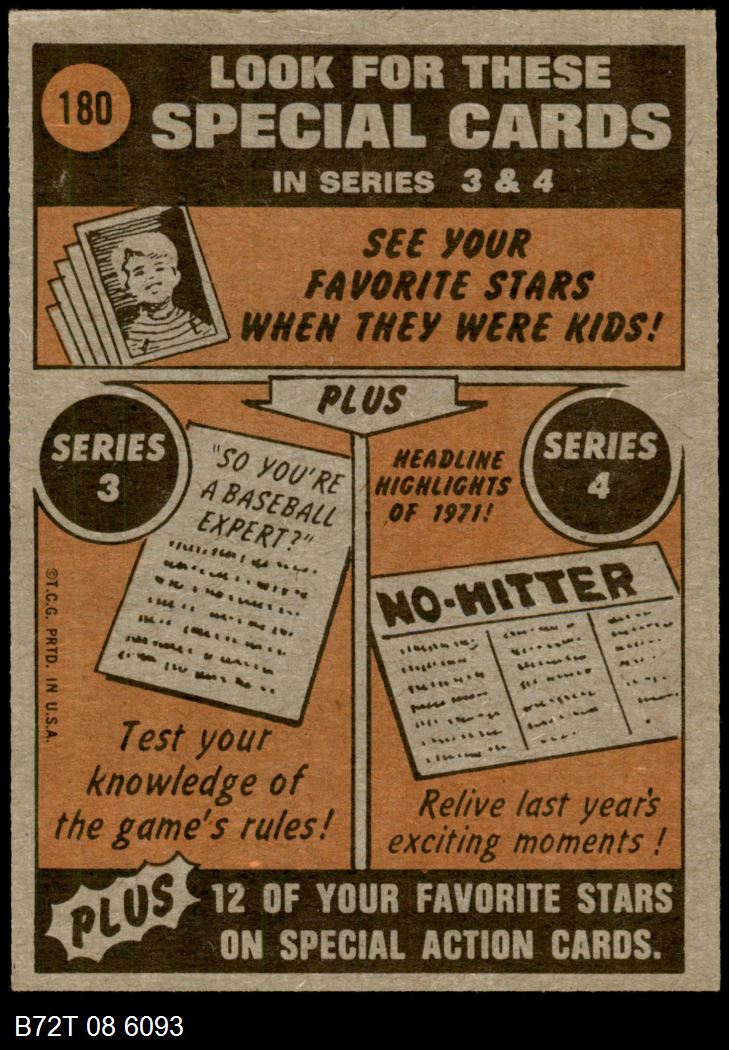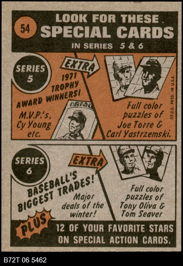 There are many great sub-series found within the 1972 Topps baseball card set including: League Leaders (85-96), Playoffs cards (221-222), World Series (223-230), Boyhood Photos (341-348 & 491-498), Awards and Trophy's cards (621-626), and Traded cards (751-757). "In Action" cards are also found throughout the set. The important rookie cards found in the 1972 Topps set include:?Carlton Fisk and Ron Cey.?