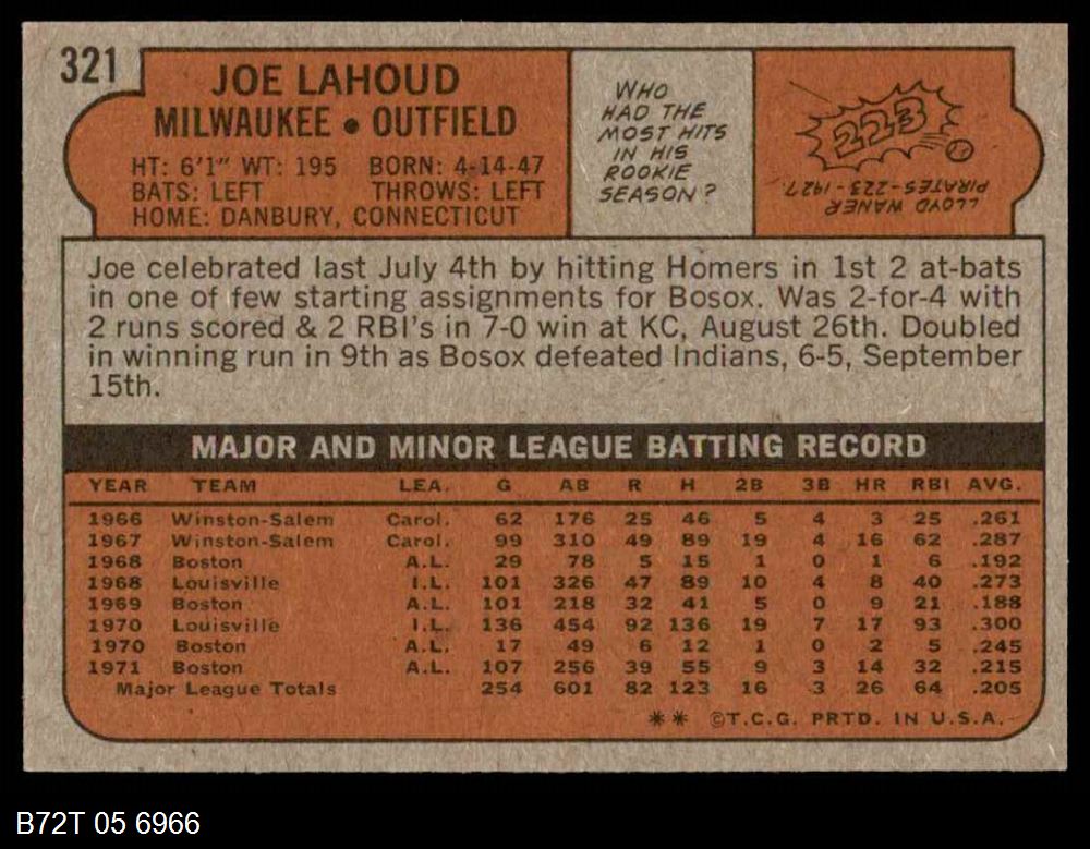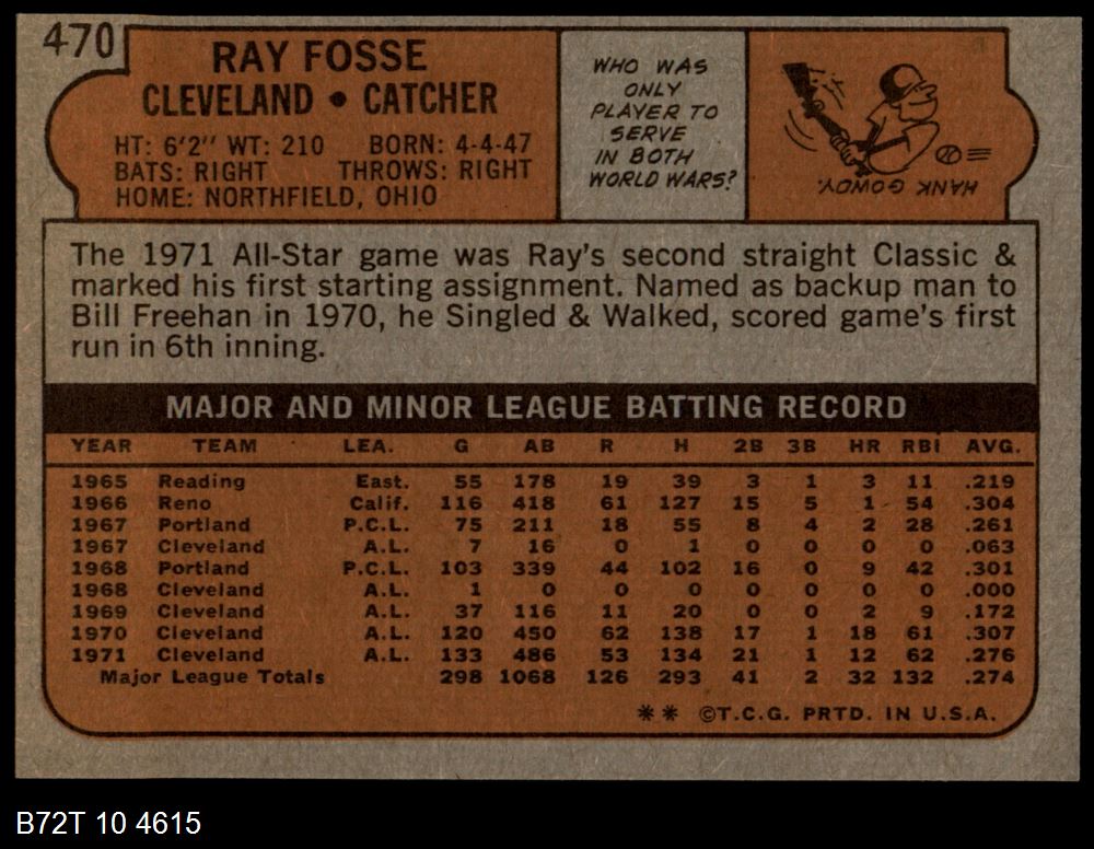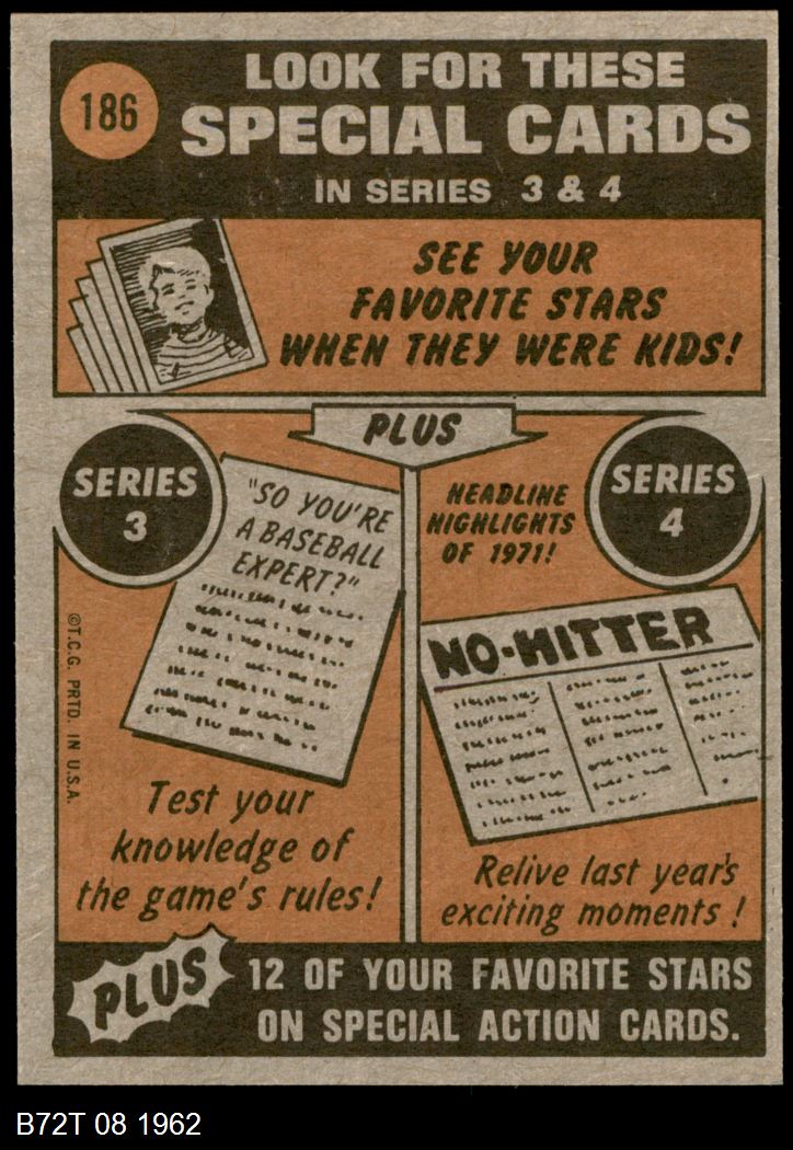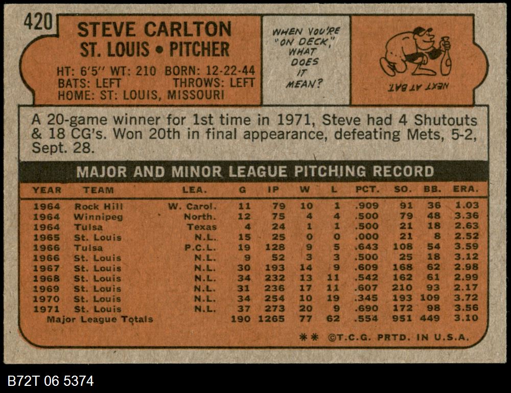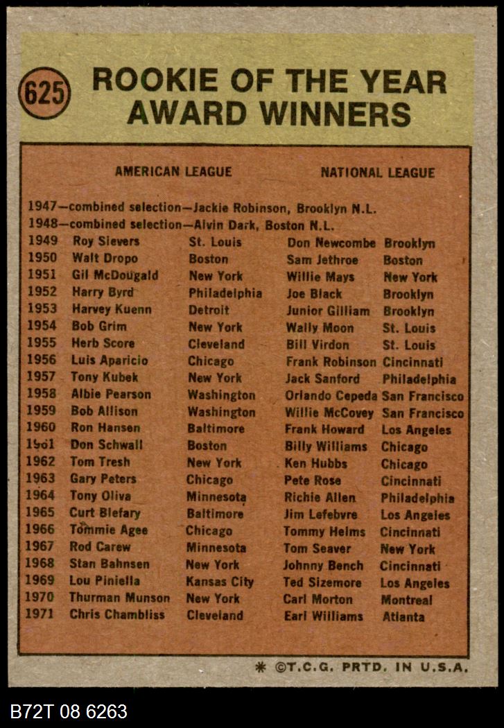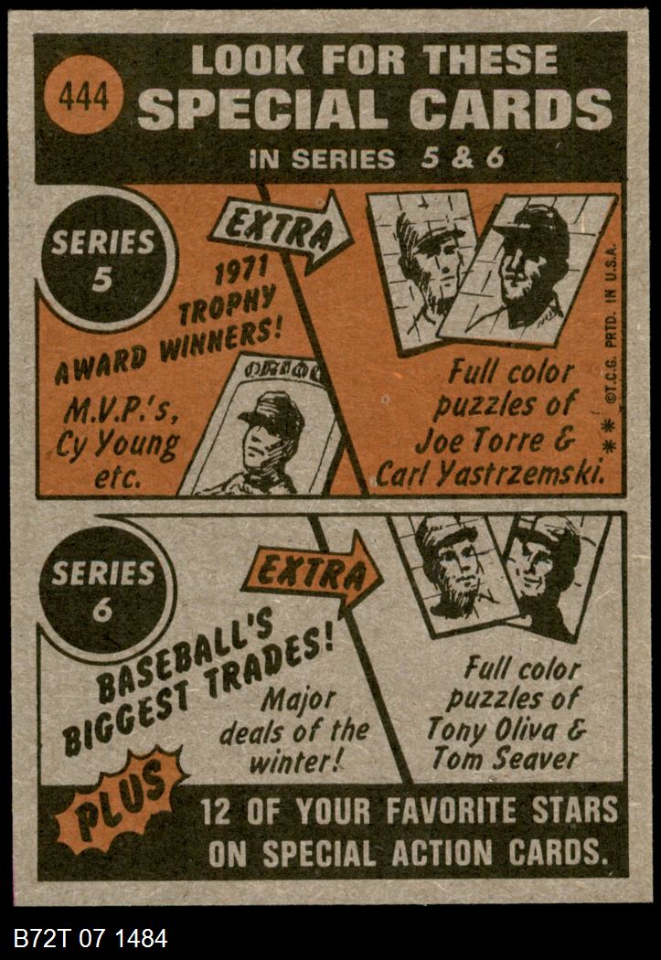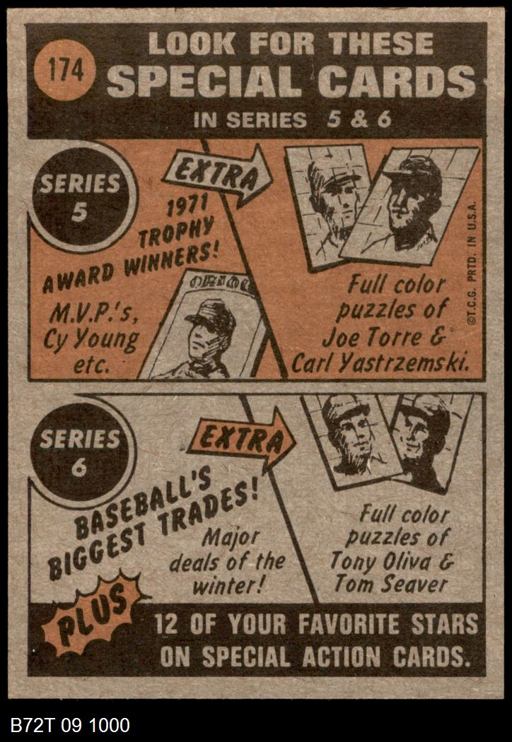 There are many great sub-series found within the 1972 Topps baseball card set including: League Leaders (85-96), Playoffs cards (221-222), World Series (223-230), Boyhood Photos (341-348 & 491-498), Awards and Trophy's cards (621-626), and Traded cards (751-757). "In Action" cards are also found throughout the set. The important rookie cards found in the 1972 Topps set include:?Carlton Fisk and Ron Cey.?