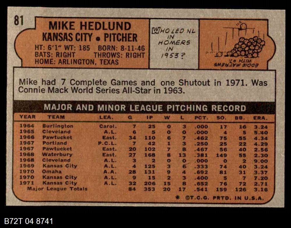 | 1972 Topps #81 Mike Hedlund | 8 - NM/MT | Front | Back |