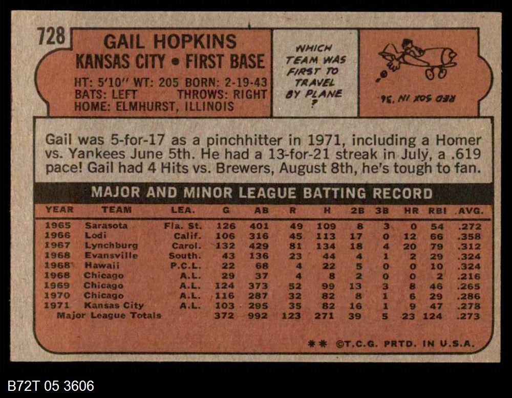 | 1972 Topps #728 Gail Hopkins | 8 - NM/MT | Front | Back |