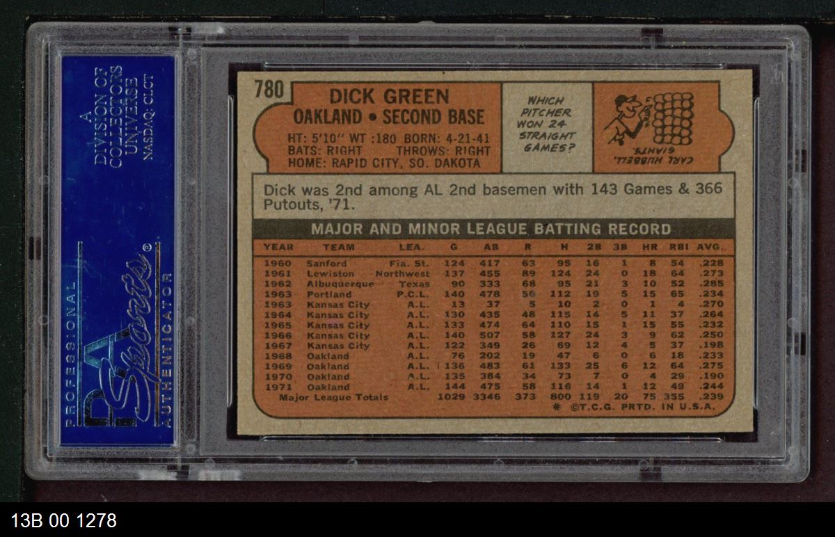 | 1972 Topps #780 Dick Green | PSA 8 - NM/MT | Front | Back |