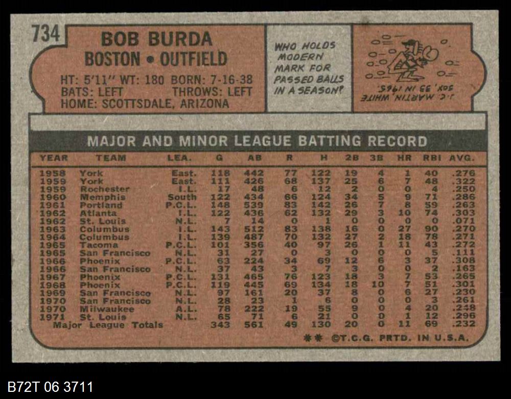 | 1972 Topps #734 Bob Burda | 7 - NM | Front | Back |