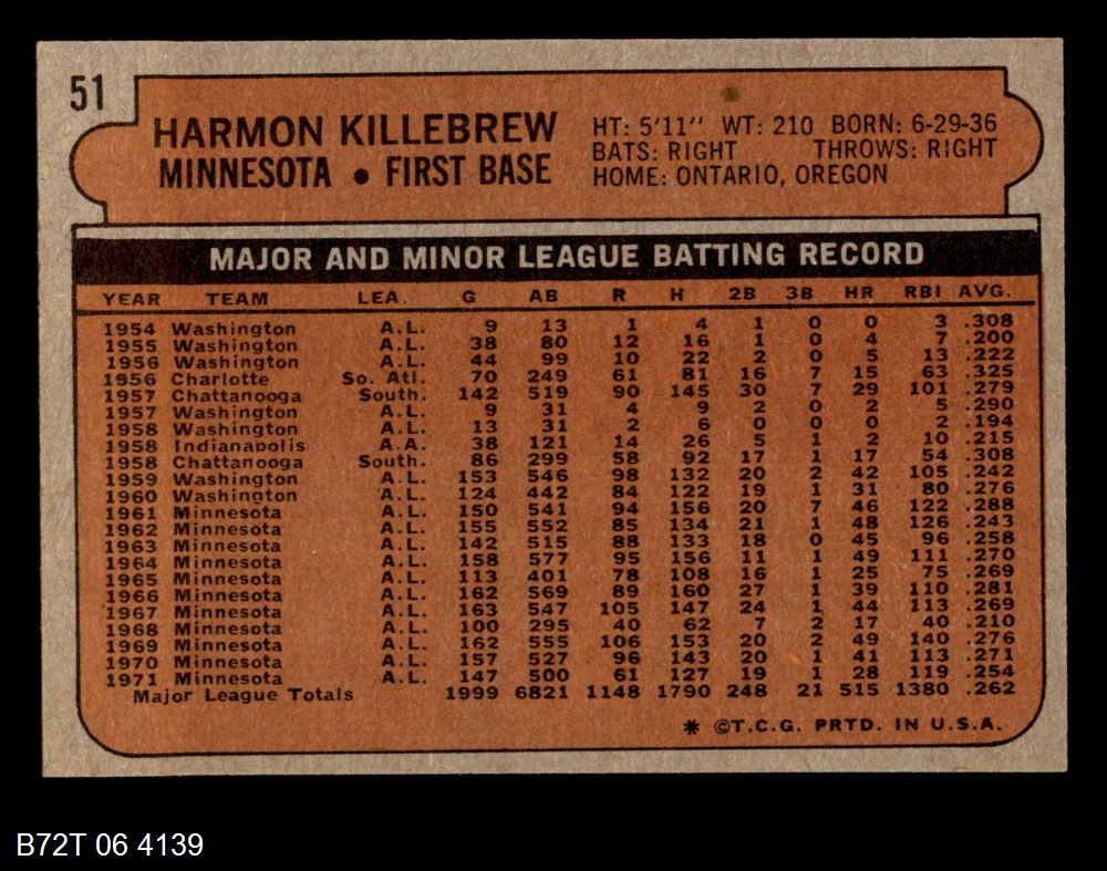 | 1972 Topps #51 Harmon Killebrew | 7 - NM | Front | Back |