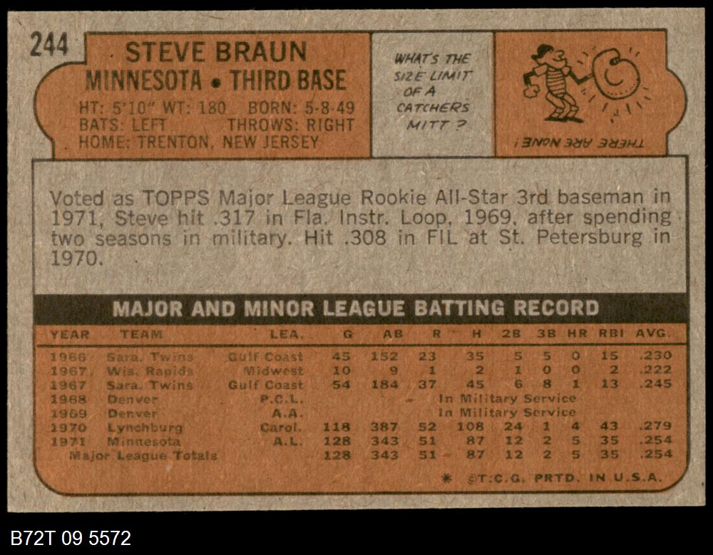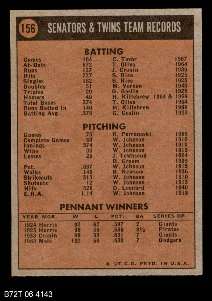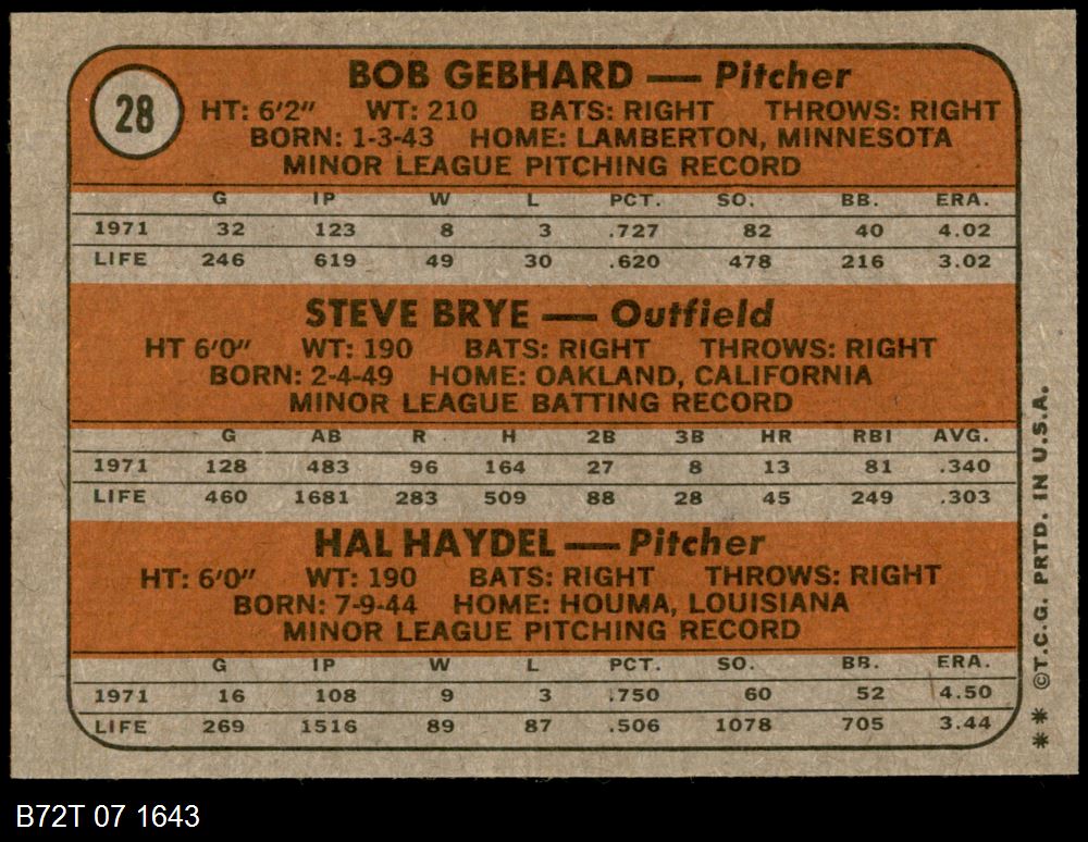 | 1972 Topps #28 - Steve Brye / Bob Gebhard / Hal Haydel Twins Rookies | 8 - NM/MT | Front | Back |