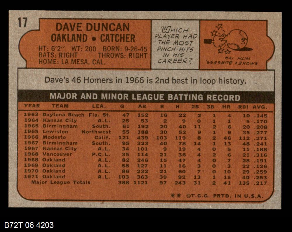 | 1972 Topps #17 Dave Duncan | 7 - NM | Front | Back |