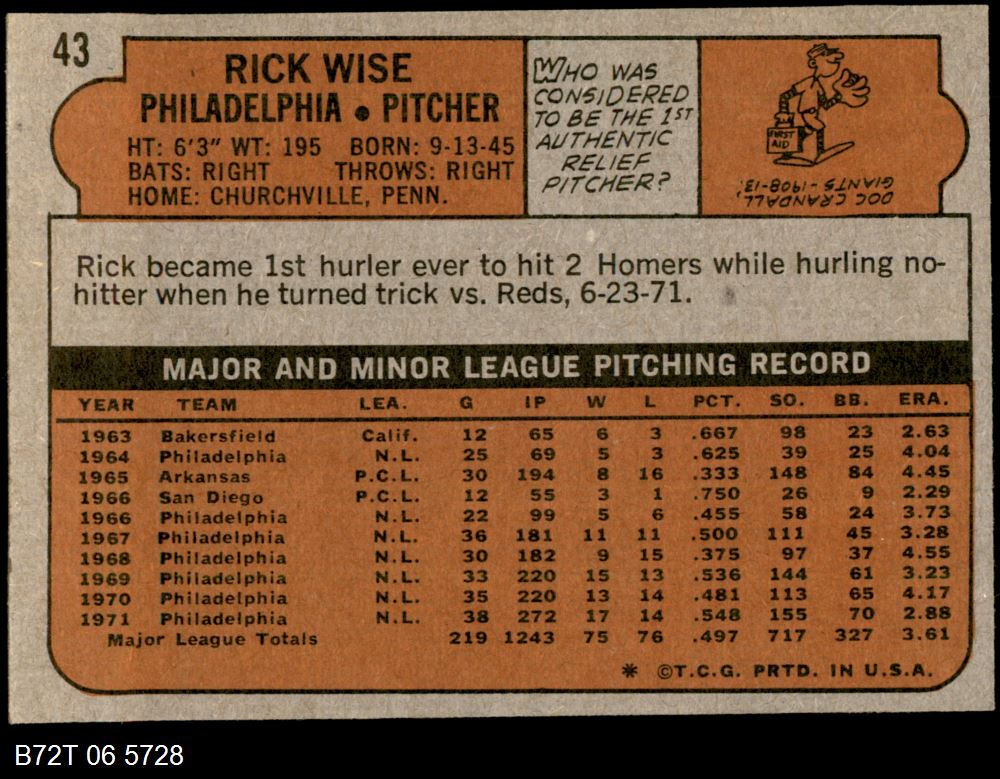 | 1972 Topps #43 Rick Wise | 7 - NM | Front | Back |