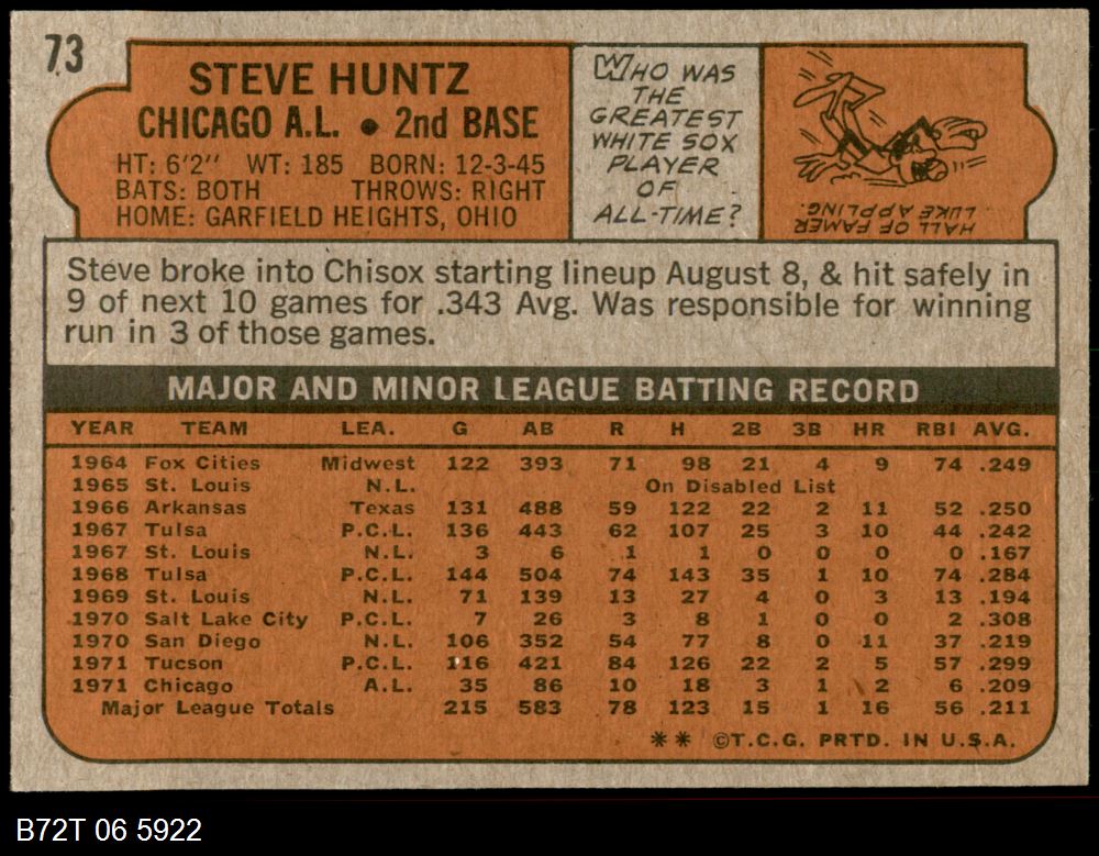 | 1972 Topps #73 Steve Huntz | 8 - NM/MT | Front | Back |
