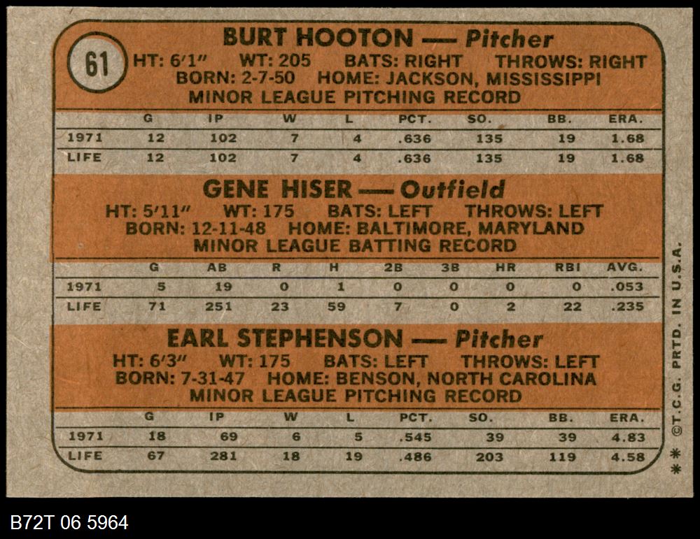 | 1972 Topps #61 - Burt Hooton / Gene Hiser / Earl Stephenson Cubs Rookies | 8 - NM/MT | Front | Back |