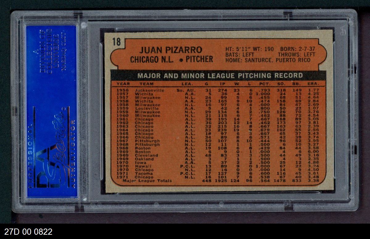 | 1972 Topps #18 YLW Juan Pizarro | PSA 8 - NM/MT | Front | Back |