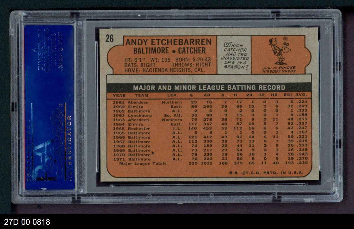 | 1972 Topps #26 Andy Etchebarren | PSA 8 - NM/MT | Front | Back |
