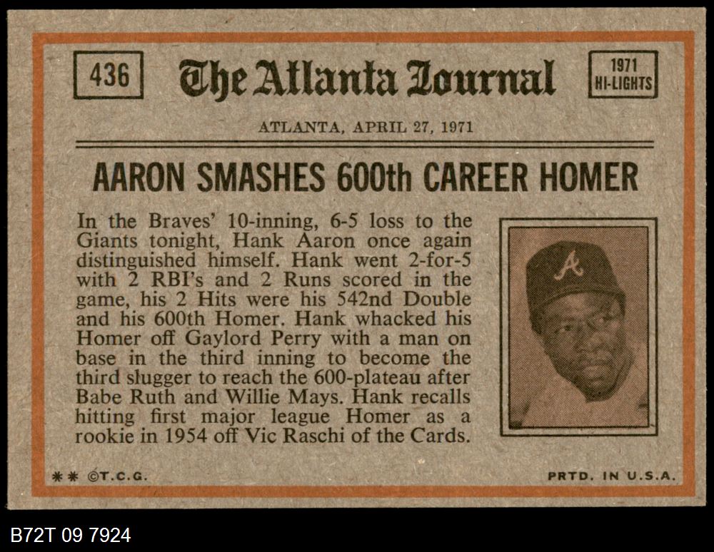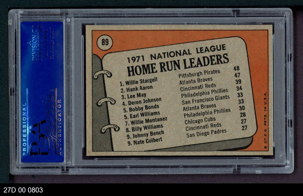 | 1972 Topps #89 - Hank Aaron / Willie Stargell / Lee May NL HR Leaders | PSA 8 - NM/MT | Front | Back |