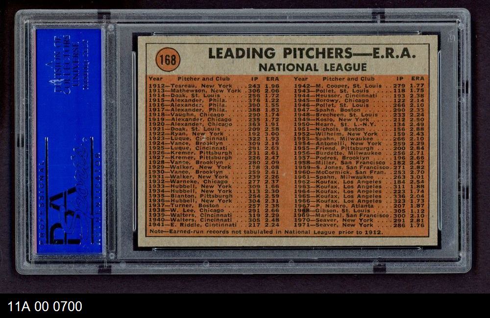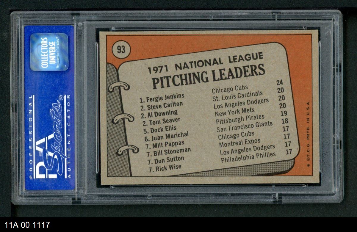 | 1972 Topps #93 - Steve Carlton / Fergie Jenkins / Tom Seaver / Al Downing NL Pitching Leaders | PSA 8 - NM/MT | Front | Back |