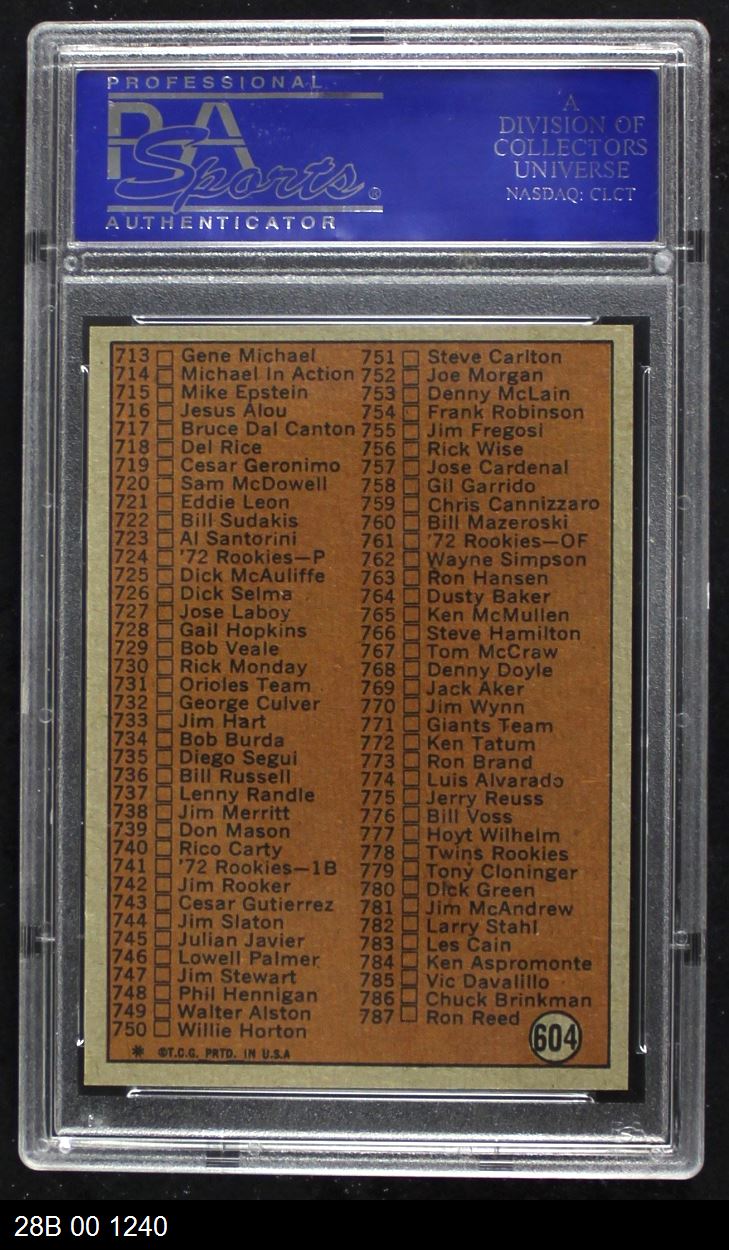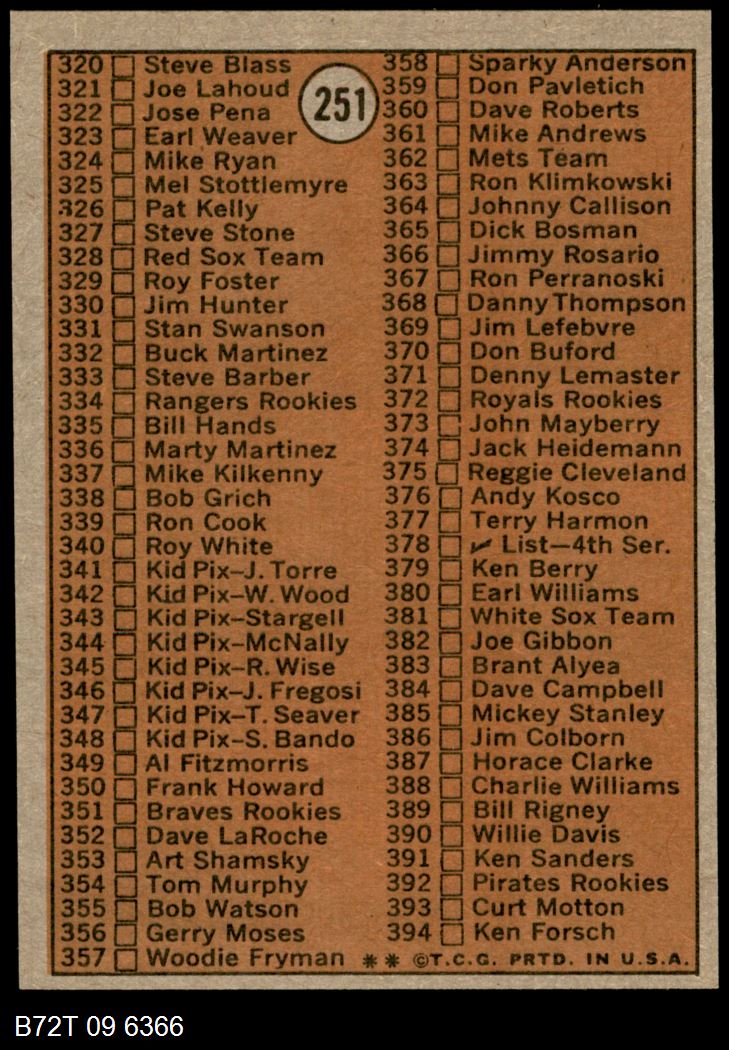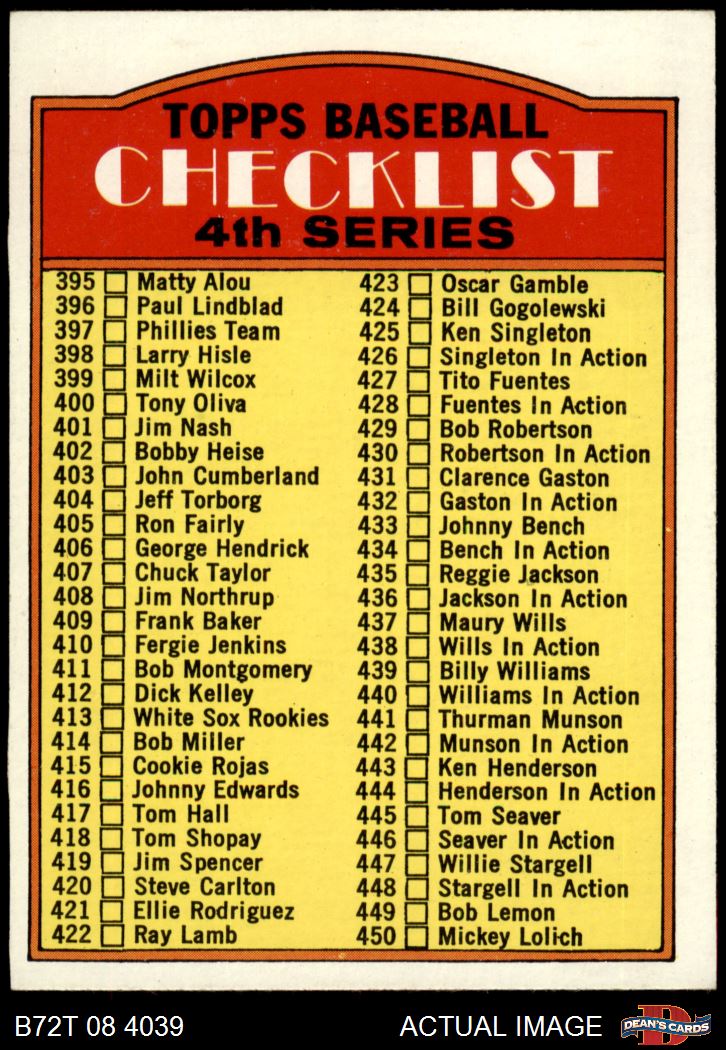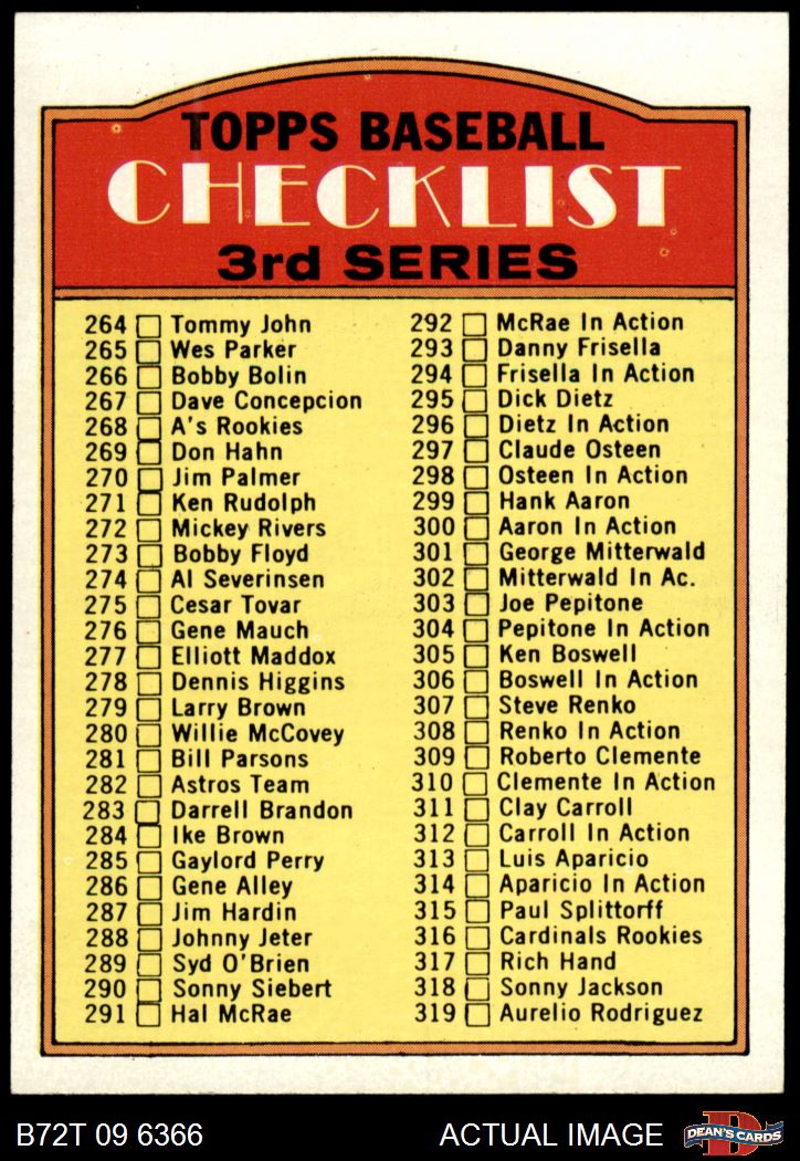 This 1972 Topps set is loaded with hall of famers including:?Yaz, Mays, Killebrew, Fisk, Perez, F. Robinson, Gibson, Morgan, Cepeda, Brock, Clemente, Fingers, Palmer, McCovey, Perry, Aaron, Aparicio, Hunter, Jenkins, Carlton, Bench, Jackson, B. Williams, Seaver, Stargell, Williams MG, B. Robinson, Rose, Marichal, Ryan, Kaline, Niekro, Carew, Carlton, Morgan, and Mazeroski.